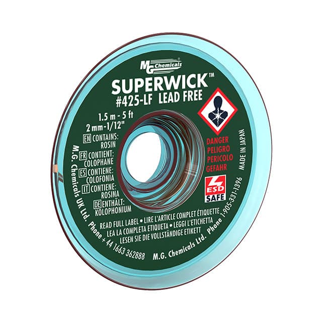 ![]() 425-LF MG Chemicals | 1 $4.9000 | Datasheet | Braid/Wick | Rosin, Mildly Activated (RMA), Lead Free | Static Dissipative (SD) | Green | 0.075" (1.91mm) | 5' (1.524m) | - | - | 72°F ~ 81°F (22°C ~ 27°C) | 7,873 Cart + RFQ |