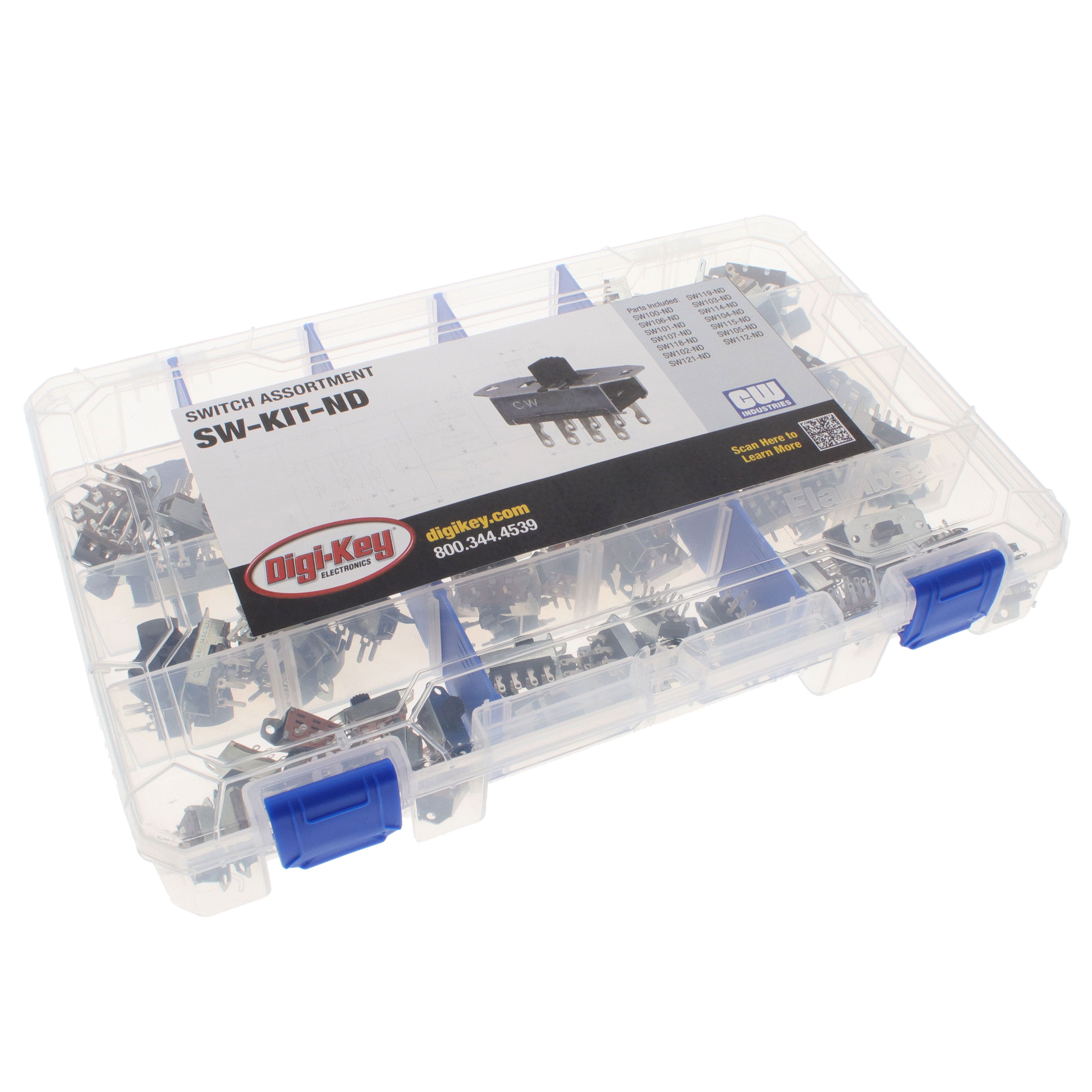 Switch kits typically contain one type of switch (tactile, pushbutton, slide, etc.), but can have a mix of current and voltage ratings along with circuit and mounting types. Each kit has varying quantities of switches in them. There are panel mount, through-hole, surface mount, R/A, and snap-in available. Circuit types include an assorted mix, SPDT, SPDT-NO, and SPST-NO.