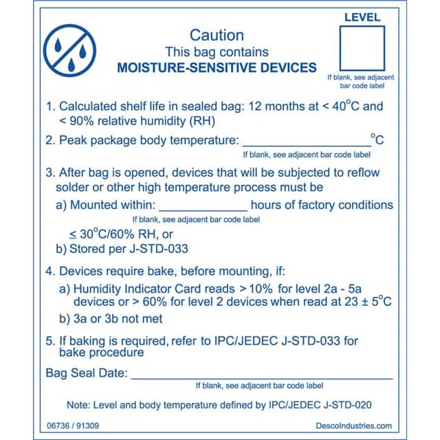 ![]() 06736 Desco | 1 $7.6900 | Datasheet | Pre-Printed | English | - | - | Symbol and Text | Caution : This Bag Contains Moisture Sensitive Devices. Calculated shelf life in sealed bag: 12 months at < 40°C and <90% rela… | See Legend (Text) | White | Blue | 3.250" (82.55mm) | 3.750" (95.25mm) | - | - | - | Adhesive | - | - | Rectangle | - | - | 1,795 Cart + RFQ |